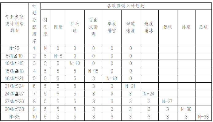 5.计划调整规则:按公布的分项目招生计划、依据上线考生填报的志愿梯次顺序录取,先录取项目一志愿,再录取项目二志愿,我校各专业在项目二志愿录取未完成的情况下,将进行计划调整,剩余的招生计划将优先调整至我校近年来重点发展的羽毛球、网球、乒乓球、自由式滑雪、单板滑雪、短道速滑、速度滑冰、篮球、排球、足球(篮球、排球、足球按照各项目综合分由高到低排序、不再分小项和男女)。按照上述计划调整规则,若出现二志愿通过计划调整录取的考生其综合分等于或低于一志愿该项目最低综合分(计划调入的项目,一志愿上线考生已被我校全部录取的情况除外)的情况,计划将调整至下一个项目,直至没有可被调整到的项目为止。
